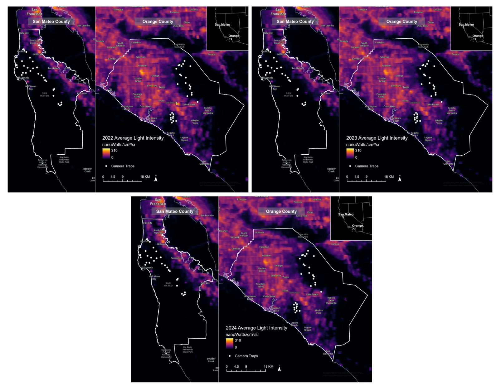 Researchers analyzed more than three years of camera-trap data collected from 61 monitoring stations in protected landscapes in Orange County and San Mateo County to understand how artificial light pollution and human activity influence wildlife activity patterns.